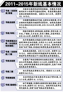 目前,擬納入2015年前建設的新線共涉及9條,總長約248.7公里。按照目前工期計劃,截至2015年底將累計開通地鐵線路475.6公里,在建86.2公里。在資金安排上,2011年至2015年建設新線總投資1097.84億元(其中至2015年前資金需求為766.02億元),加上目前在建線路、規劃調整線路投資及2016年至2020年新線前期研究費用,涉及總投資1893億元。按照目前初步的工期安排,2015年底前資金需求約為1551.50億元。