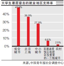 2009年,中國青年報社調中心通過網絡對全國31個省、區、市的7761名應屆畢業生的調查也顯示,34.2%的人就業首選省會城市或發達的地級市,其次是普通地級市(26.4%),而北京、上海等大城市則降到了第三位,約為24.7%。
