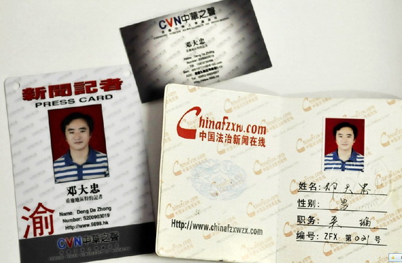11月17日,專案民警在重慶市北部新區一網吧內將鄧大忠抓獲歸案。民警現場繳獲鄧大忠隨身攜帶的“香港中華之聲通訊社”重慶地區特約記者證一本、“中國法制在線”新聞工作證一本、“香港中華之聲通訊社”重慶地區特約記者名片25張、蓋有“鑫利易得文化傳媒(北京)有限公司”公章的收據一本以及U盤、筆記本、數碼錄音機等。