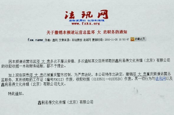 該通知稱,“因本頻道運營總監鄧大忠多次不服從安排,多次通知其交回所領取的鑫利易得文化傳媒(北京)有限公司的收款收據一本和財務結帳,都不予理會。加上現在獲悉鄧大忠已被重慶警方控制,為嚴肅法紀,本公司特作出決定,撤銷鄧大忠重慶頻道運營總監職務,其所領取的工作證(編號FX012)作廢,收款收據(0183501--0183520)作廢。其一切行為與法訊網以及鑫利易得文化傳媒(北京)有限公司無關?!?