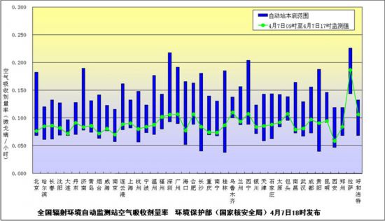 下圖是環境保護部(國家核安全局)4月7日18:00繼續發布的全國省會城市和部分地級市輻射環境自動監測站實時連續空氣吸收劑量率監測值。監測結果匯總圖中綠色曲線代表監測值,藍色柱體代表天然本底水平,綠色曲線均在藍色柱體范圍內。監測結果表明,目前我國環境輻射水平仍在本底范圍內,日本核電事故未對我國環境及境內公眾健康產生影響。