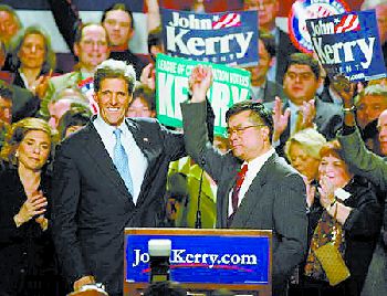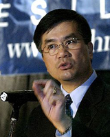 (2004年10月13日,美國第一位華裔州長、華盛頓州州長駱家輝(中)前往紐約華埠,為民主黨總統候選人克里爭取亞裔選票)