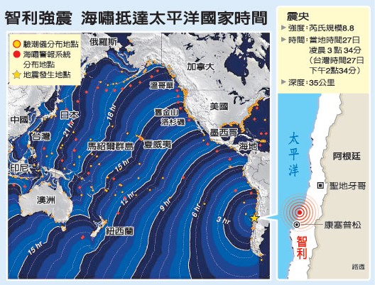 智利地震海嘯太平洋分布圖 日本海嘯或達3米