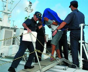 (中國漁船船長詹其雄被日方逮捕,“蒙面帶銬”者)