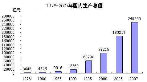 同時,中國經濟的快速增長使經濟總量呈現加速擴張態勢。國內生產總值由1978年的3645億元迅速躍升至2007年的249530億元。其中,從1978年上升到1986年的1萬億元用了8年時間,上升到1991年的2萬億元用了5年時間,此后10年到2001年平均每年上升近1萬億元,2001年超過10萬億元大關,2002-2006年進入高速增長期,平均每年上升2萬億元,2006年超過20萬億元,在此基礎上,2007年一年又增加3.76萬億元。