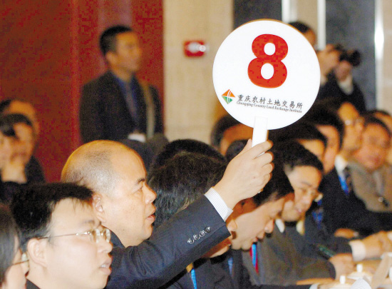 12月4日,一家企業的負責人正在重慶農村土地交易所舉行的首場交易會上競拍。