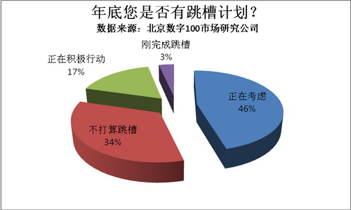經濟觀察網 記者 韋承武 臨近年底,又到了一年一度的跳槽高峰。度過了“金九銀十”的黃金招聘季節后,最終確定了要跳槽的人有多少?企業要籌備明年的運營計劃,需要“挖角”而導致人才流失的頑疾又是哪些?近日,北京數字100市場研究公司開展了一項“年底,你有跳槽計劃嗎?”的調查,數據顯示,有46%的人正在考慮跳槽。