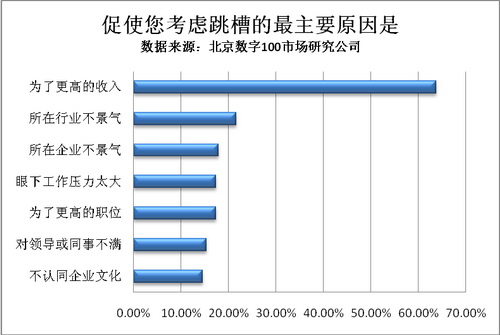 跳槽原因:63.8%的人為了高收入。15.4%的人是因為 “對領導或者同事不滿”