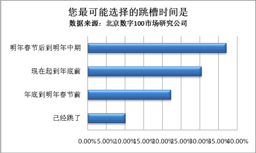 放棄眼前利益,選擇自己認為更有利的前程,可見人們對跳槽帶來的改變“寄予厚望”。那么,準備跳槽的人最終會在什么時間邁出這一步呢?從調查結果可以看出,人們選擇跳槽的時機,以春節前后為主。37.1%的人會選擇在“明年春節后到明年中期”(2月-5月);30.5%的人選擇跳槽的時間是“現在起到年底前”(10月-12月);22.3%的人選擇的跳槽時間是“年底到明年春節前”(12月-2月);有意思的是,有10.1%的人根本不去給自己考慮的時間,他們的狀態是“已經跳了”!