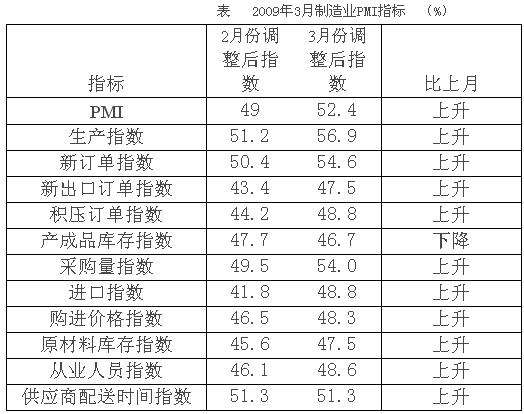 經濟觀察網 記者 韋承武 4月3日,中國物流與采購網公布的數據顯示,2009年3月,全國制造業采購經理指數(PMI)為52.4%,高于2月3.4個百分點。該指數自2008年12月份開始連續第四個月回升,本月已上升到收縮與擴張臨界點—50%以上。中國物流與采購聯合會稱,這表明中國擴內需、保增長的政策措施開始發揮積極作用,企業生產逐步恢復,制造業經濟總體上呈底部趨穩回升態勢。