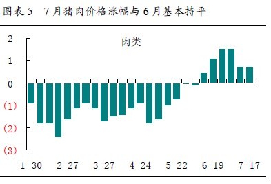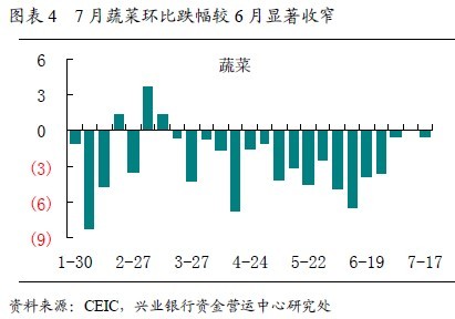 興業銀行資深經濟學家魯政委分析,占整個CPI指數30%左右權重的食品價格7月環比降幅顯著收窄。從商務部數據來看,7月環比下跌幅度較6月顯著收窄。農業部農產品批發價格總指數也顯示7月環比跌幅(-1.1%)較6月的(-1.8%)有小幅收窄。同時,統計局數據亦顯示7月食品環比跌幅將較6月收窄。而非食品類價格環比在-0.1%~0.2%區間。因此他預計7月CPI環比預計在-0.2%~0.2%??紤]翹尾因素-1.4%,CPI同比預計落入-1.9%~-1.6%的區間內,中值為-1.7%,同比跌幅與上月基本持平。