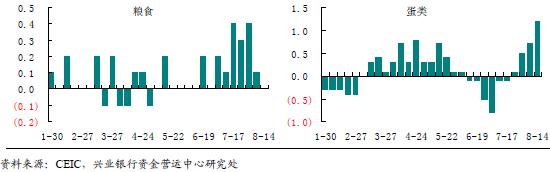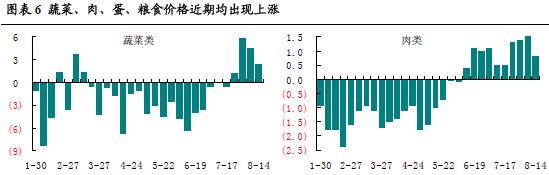 各部委數據顯示,8 月食品價格環比回升。從商務部數據來看(見圖表6),從7 月下旬開始至今,肉、蛋、蔬菜、糧食價格周環比均為正,且漲幅已接近或超過今年2月以來的最高值。因此,8 月食品價格將較7 月出現顯著上漲。農業部農產品批發價格總指數和“菜籃子”產品批發價格指數也顯示,7 月中旬以來,農產品批發價格已從低位穩步回升。從統計局所公布的50 個城市主要食品旬度平均價格變動情況看,7 月下旬至8 月中旬,蔬菜、豬牛羊禽肉、雞蛋價格上漲幅度均顯著高于6、7 月;面粉價格小幅上漲,漲幅與上月基本持平。食用油、水產品的價格下跌,跌幅略高于7 月。