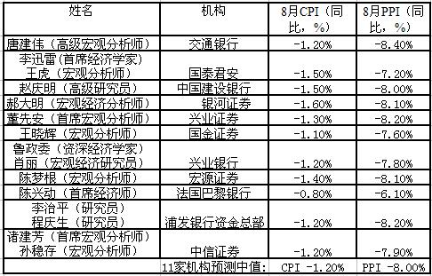 中國國家統計局將于9月11日公布8月CPI、PPI數據,接受經濟觀察網訪問的11家機構對8月CPI的預測中值為同比-1.2%,PPI為同比-8.0%,相比此前7月的CPI(-1.8%)、PPI(-8.2%)數據,降幅均有所收窄。