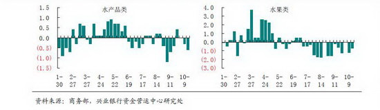 從商務部數據來看,10月以來,除糧食和雞肉價格明顯上漲外,豬肉、蛋、蔬菜、水產、食用油、水果等主要食品價格一致回落。10月份環比下降是通常的季節性規律,歷年10月食品環比均低于9月。非食品價格也顯示了類似特征,10月非食品環比在絕大部分年份中亦低于9月。