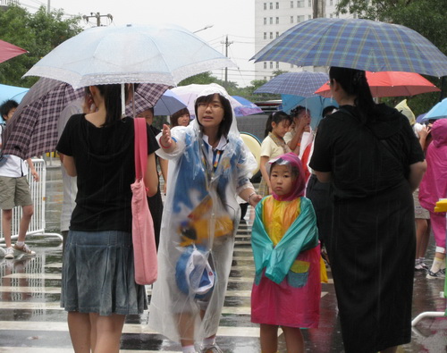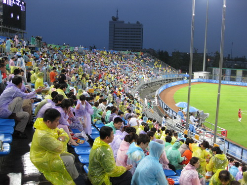 我費了半天勁,找到了五棵松棒球場。到門口一問,志愿者特別熱情的告訴我,您找錯地方了。這里才到五棵松,這倆不是一地方。于是,我就又開始在風雨中一直問著路往豐臺趕,好在志愿者和交警阿姨也特多,最終及時趕到了地方。但門口檢票的志愿者又是特別熱情的告訴我,下雨,比賽暫時還沒進行,您先等著吧。