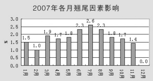 我們測算得到的2007年各月“翹尾因素”的結果顯示,1月份“翹尾因素”值為1.5%,2月份為1.0%,而3月份“翹尾因素”的影響將驟然提升至1.9%。該測算結果比我們此前的預測每月低0.1個百分點,造成測算差別的主要原因是這次我們得到了去年12月份正式的環比數據。