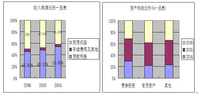 該行利潤構成的主要特點是投資收益較大,2006年投資收益占比50%。公司債券業務規模較大,資產負債管理期限匹配基礎較好,資金使用效率和頭寸運用較好;但是公司盈利水平受利率波動和的影響較大,市場風險管理任重道遠。值得注意的是,2006年度利率持續上升,導致該行債券收益率下降,債券投資收益主要靠規模擴張。