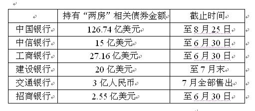 截至6月底,中信銀行持有價值11.8億美元由房利美和房地美發行的抵押貸款支持證券,并持有這兩家抵押貸款巨頭發行的價值4.03億美元的公司債券。中信銀行行長助理曹國強表示,目前該行的確持有兩房的債券總值約15億美元,將會在適當時機減持,而兩房擔保的按揭抵押證券暫有幾千萬美元,將會持有至到期。
