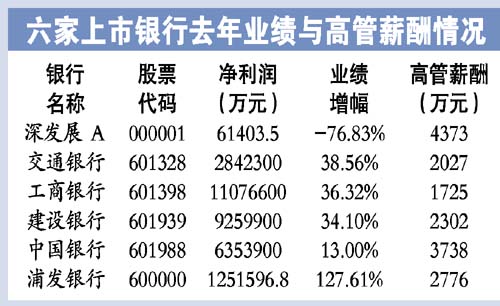 在業績大幅增加的同時,中國銀行高管的收入狀況出現整體降薪的情況。深發展A以合計高達4373萬元的年度報酬總額成為目前為止披露報酬最多的上市銀行,其在2007年的薪酬更是高達2285萬元。緊隨深發展之后的是中國銀行,去年總共發放了3738萬元的報酬。相較之下,工商銀行支付的高管薪酬總額最低,總共發放了1725萬元。而在支付的高管薪酬總額變化中,只有中國銀行和浦發銀行的支付總額是上升的,其他4家均呈下降態勢,其中,降幅最大的為工商銀行和建設銀行。工商銀行高管薪酬總額從2007年的2736萬元,下降到2008年的1725萬元,建設銀行從3177萬元降為2302萬元,降幅分別達到36.95%和27.54%。