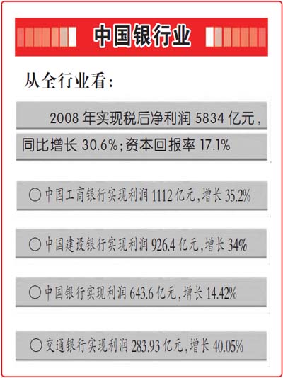 經濟觀察網 記者 鄧美玲 各大上市銀行的2008年年報披露也讓整個行業的資產狀況被人們了解。從行業來看,08年,中國銀行業實現稅后凈利潤5834億元,同比增長30.6%;資本回報率17.1%,預計比全球銀行業平均水平高7個百分點以上;全行業利潤總額、利潤增長和資本回報率等指標名列全球第一。