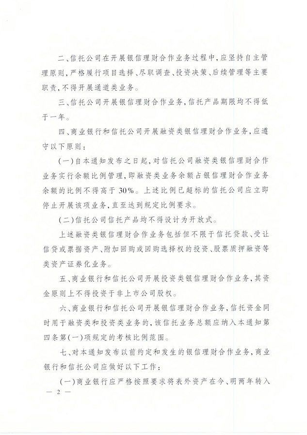 其中,銀監會重點對融資類銀信理財合作(也即表外信貸)進行了嚴格的限制。例如,根據《通知》第四條款規定,融資類業務余額不得超過銀信合作業務余額的30%,且不得設計為開放式。
