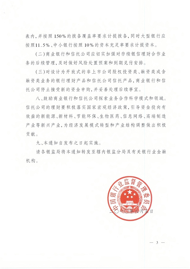 根據這份通知,在今明兩年內,商業銀行在《通知》發布之前發行的存量表外資產都要轉入表內,并按照150%的撥備覆蓋率要求計提撥備。