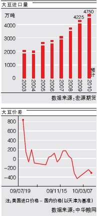 美國農業部一份報告顯示,截至2010年4月29日,過去一年中國訂購了2190萬噸的美國大豆,比上年同期增加了370萬噸,占到同期美國大豆出口訂購量的58.6%。報告稱,在中國大豆進口增加的推動下,美國全年大豆出口訂購量將從去年的3240萬噸增加到今年的3740萬噸。