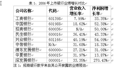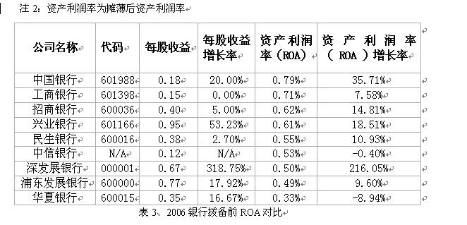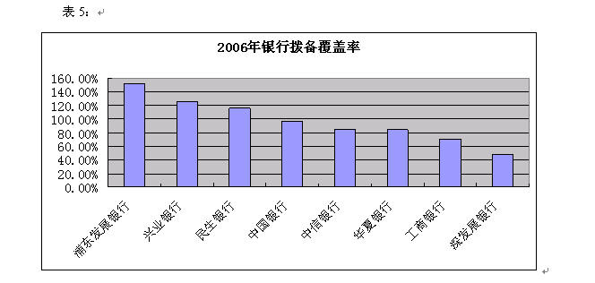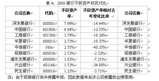 值得注意的是,在資產增加的同時,浦發銀行和民生銀行的不良貸款絕對值都有所上升,浦發銀行的不良貸款從05年的74.44億元上升到06年的84.40億元,民生銀行的不良貸款從48.28億元上升到06年的55.02億元。有意思的是,雖然民生銀行的不良貸款絕對值有所增加,但在目前披露年報的銀行中,仍是不良貸款率最低的銀行,而深發展銀行則以7.99%的不良資產率“高居榜首”,深發展凈利潤高速增長的主要動因來自于相較于同類上市公司較少的計提貸款損失準備。2006 年度公司撥備覆蓋率由43%上升到48%,但和其他股份制銀行超過100%的撥備覆蓋率仍相去甚遠。如果深發展2006 年末將自己的撥備覆蓋率提到55%左右,公司的凈利潤將和去年持平,300%多的凈利潤增速化為烏有。由此可見,高達319%的凈利潤增速有很大一部分是因為公司較為“激進”的計提撥備方式所致。