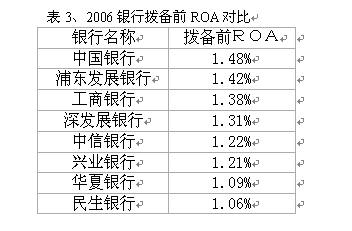 資產利潤率是衡量銀行運用資產獲取收入能力的重要指標。我國銀行的資產利潤率(ROA)仍普遍然處于較低水平,以國際排名前100家大銀行為例,1992~2002年ROA的平均水準在1.17%~1.20%之間,中信證券做過一個研究發現,全球上市銀行ROA平均值為0.92,。而從表2可以看到,最好的中國銀行是0.79%,最差的華夏銀行則只有0.33%。從增長情況看,中國銀行、招商銀行、興業銀行、民生銀行資產盈利能力增長較快,中信銀行有微小下降,華夏銀行則降較快。值得注意的是,除興業銀行06年的ROA(0.62%)低于04年(0.64%)以外,其余各銀行06年的資產利潤率相對于05年的增長幅度相對于前一天都有較大幅度的增長。