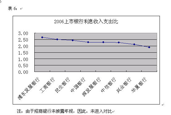 受06年銀行利差擴大,各銀行利差均比05年有不同程度的增長,從橫向比較看,如果按利息收入支出比來評價銀行利差的話,浦東發展銀行和工商銀行利差較高,表明其存貸款獲利能力較高,而興業銀行和華夏銀行則位居后列。
