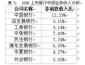 值得注意的是,排名最后的興業銀行2006年非利息收入占比同比減少7.54%,在總凈收入中的占比下降到2.92%,在非利息收入中,手續費及傭金收入仍然保持了較快的增長,但公允價值凈損益的減少以及其他業務凈損益增速減緩拖累了非利息凈收入的增長。