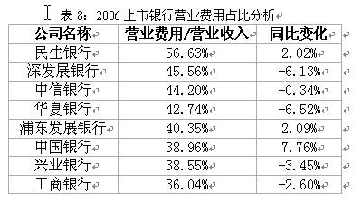雖然06年大部分銀行都在進行營業網點的擴張和對中間業務的投入,但營業費用占營業收入的比率月增加的不明顯,特別需要注意的是,民生銀行營業費用占比較高,并比05年增長了2.02%。深發展銀行、中信銀行、華夏銀行雖然營業費用絕對值都有較高增長,但卻低于營業收入的增長速度,其營業費用占收入反而有所下降。2006年全年中國銀行費用控制效果顯著。其中雖然員工費用306.77億元,較上年增長27.93%;但業務費用172.83億元,僅比上年增長9.79%。而浦東發展銀行的員工費用大幅增長43.7%,直接導致了營業費用占比的上升。