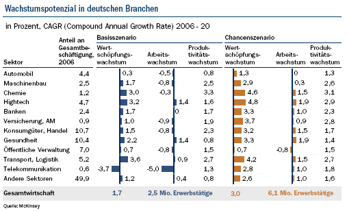 麥肯錫提出兩種方案,目的是讓一些行業成為經濟增長的動力。根據去年的增長數據,麥肯錫推導出在所謂的基本方案中,即到2020年為止,如果每年經濟增長率保持1.7%的速度,那么德國將出現250萬個就業機會。這樣的觀點聽起來讓人覺得前途光明,尤其是德國在過去的十年中呈現出越來越糟糕的經濟趨勢(根據2008年1月15德國聯邦統計局公布的數據,2007年德國經濟增長率為2.5%,低于2006年的2.9%)。