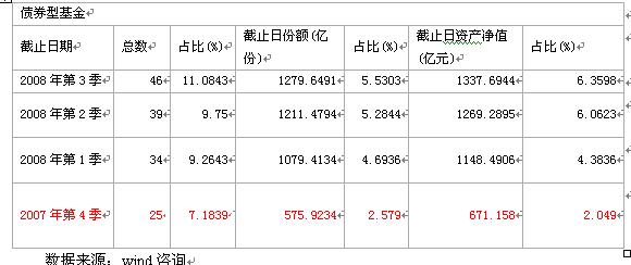目前的市場狀況下,債券基金在資產的安全性和流動性方面優勢明顯,機構投資者紛紛提升了債券基金的投資比例。據統計數據顯示,債券基金的資產由去年年底的671億上升到3季度的近1338億,占全部基金資產比例也由2%上升至6.4%,而個人投資者占比由年初的38.83%上升到2季度末的47.02%。