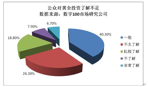 數字100市場研究公司的數據顯示,超過三成的公眾對黃金“投資不太了解”或根本“不了解”。40.3%的人對投資黃金了解程度“一般”。那些已經進行黃金投資的人群中,比較了解黃金投資的也僅為35.6%。業內人士認為,銀行和有關機構應在推廣黃金投資業務的同時,加強對投資者進行黃金專業知識以及投資風險等方面進行指導和教育。幫助投資者從理念上逐漸改善其投資策略、操作技巧,少一些盲目的沖動,把參與黃金市場作為一種正常的投資行為,而不是一夜暴富的場所。