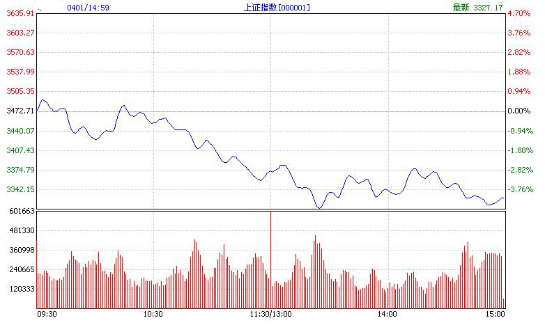 今日(4月1日)滬指開盤報3461.08點,最低3493.13點,最低3356.02點,全天收報3829.16點,下跌143.55點,跌幅4.13%,成交金額752億,23只個股上漲,876只個股下跌;深成指開盤報13274.74點,最高13399.96點,最低12658.28點,全天收報12460.62點,下跌841.51點,跌幅6.33%,成交金額370億,5只個股上漲,696只個股下跌。兩市跌停個股逾200家。今日午后,中國石油和中國石化再度跳水,加上銀行股、地產股也放棄抵抗,紛紛出現大幅下挫,滬深股市的跌幅不斷擴大,滬綜指最大跌幅超過160點,深成指跌幅超過800點,絕大多數板塊跌幅超過7%,當前兩市跌停個股增加到了200多家。