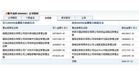 從4月3日到5月14日的深交所交易公開信息來看,拉動隆平高科第一輪暴漲的多數是上海、江浙、深圳的營業部,其中包括東方證券上海寶慶路營業部、東方證券上海建國東路營業部、申銀萬國上海陸家嘴環路營業部、銀河證券寧波解放南路營業部、國信證券深圳泰然九路營業部等著名的“敢死隊”所在營業部。但是在拉動隆平高科股價第二輪暴漲的過程中,上述幾個營業部除了國信證券深圳泰然九路營業部外沒有一家出現在席位上,這次充當前鋒的是招商證券上海陸家嘴東路營業部、江海證券深圳寶安南路營業部、渤海證券上海彰武路營業部、華泰證券無錫解放西路營業部等,但依舊集中于上海、深圳、江浙地區。