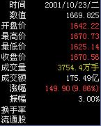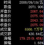 網絡版專稿 記者 鄧美玲 9月19日,本周的最后一個交易日,罕見的大紅行情出現。滬市收報2075.09點,上漲9.45%;深市收報7554點,上漲9%。9.45%的漲幅也創下了繼2001年10月23日大盤漲停后的又一次大盤漲停。