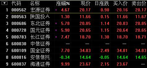 受證監會啟動融資融券試點工作這一消息的影響,今天的券商板塊表現強勁。早盤時券商股集體高開,盡管下午大盤遭遇打壓,但是券商股依然成了今天最出色的表現者。沖至漲停的海通證券今天換手創新高,至23%。而國金證券、長江證券漲幅也都超過5%。