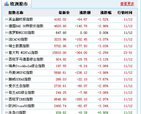 至收盤時,德國法蘭克福股市DAX指數12日下跌2.96%,報收于4620.80點。巴黎CAC40股指高開后震蕩下行,尾盤報收于3233.96點,較前一交易日下跌3.07%。礦業股和能源股繼續下滑致使12日倫敦股市大幅收低,《金融時報》100種股票平均價格指數最終報收于4182.02點,比前一交易日下跌64.67點,跌幅為1.52%。