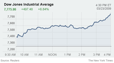 經濟觀察網 記者 焦建 美股周一大幅飆升,好于預期的二手房銷量數據以及財政部買進銀行不良資產計劃細節的公布為股市了提供上漲動力,截至收盤,道指上漲了497.48點,報收7775.86點,創自2月13日以來新高,漲幅為6.84%;標準普爾500指數上漲了54.51點,至823.05點,漲幅為7.09%;納斯達克綜合指數上漲了98.50點,至1555.19點,漲幅為6.76%。主要股指漲幅超出了6%,道指也創下自去年10月以來單日最大漲幅。