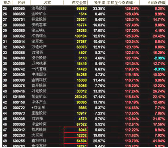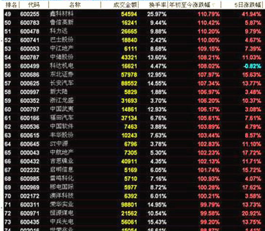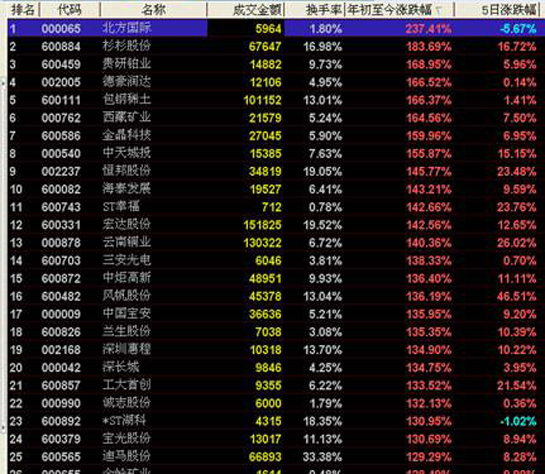 在漲幅排名前十的股票中,北方國際以237.41%%的漲幅位居第一。在排名前十的股票中,有色金屬板塊占據三席(貴研鉑業、包鋼稀土、西藏礦業)。詳細情況參見下圖。