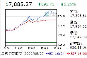 經濟觀察網 記者 鄧美玲 受香港政府追加經濟刺激方案及恒指期貨今日到期等因素影響,5月27日港股大爆發。早盤高開后一路向上,最終恒生指數報17885.27點,上漲893.71點,漲幅為5.26%;國企指數(H股指數)報收10202.25點,上漲518.18點,漲幅為5.35%;紅籌指數報收3699.18點,上漲165.26點,漲幅達4.68%。大市成交930.56億港元,同比上日大幅放大。