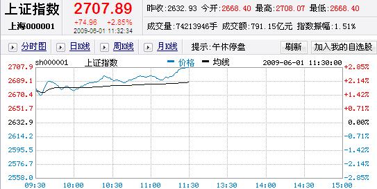 今日大盤在外盤的影響下走強,至上午11:17分,滬指報2695.08點,漲幅達2.37%;深成指報10361.06點,漲幅達2.3%。滬指午盤報2707.89點,漲幅達2.85%;深成指報1.378.9點,漲幅達2.48%.