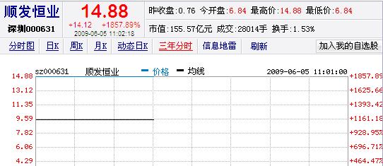 *ST蘭寶于2006年4月份停牌,停牌前最后一個交易日收盤價為0.76元。今日開盤以6.84元開盤,漲幅已經超過了900%,而這還未抑制住其飆漲的激情,開盤后不到一分鐘時間,順發恒業就直線飆升至樂14.88元,漲幅達到了1857.9%!