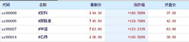 N安科、N探路者、N華誼、N億偉四只股票領漲創業板,其中N安科上漲160.588%,一躍成為28家創業板上市公司領跑者。截止發稿,N銀江上漲48.3%,位居28家末席。