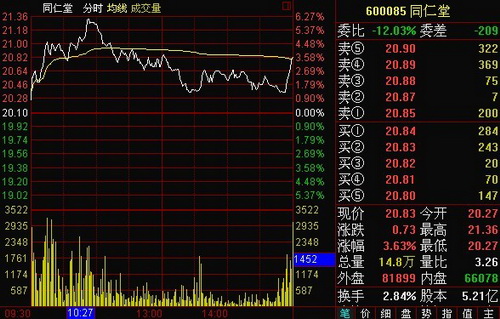 同仁堂在經歷了上一個交易的大跌后,12月18日走出逆市上漲行情。早盤稍稍高開之后便一路沖高,最高漲幅超過6%,成交量亦迅速放大,雖然午后漲幅被打壓下來,但尾盤仍然高收3.63%,至每股20.83元。而據和訊網18日早盤間報道稱,從盤口觀察,該股18日開盤明顯有機構資金重倉介入,從而刺激股價大幅飆升。