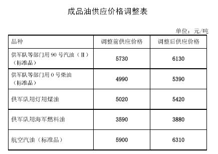 成品油生產經營企業供軍隊及新疆生產建設兵團、國家儲備用汽、柴油(標準品,下同)供應價格每噸均提高400元,調整后的汽、柴油供應價格分別為每噸6130元和5390元。其他成品油價格相應調整。調整后的成品油標準品價格見附表一。非標準品價格由成品油生產經營企業按照國家規定的品質比率確定。