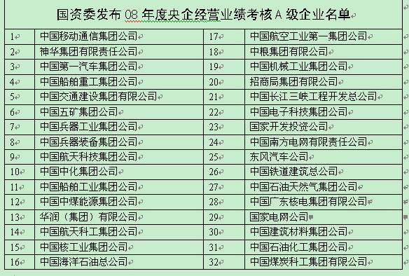 經濟觀察網 實習記者 李夢竹 7月23日,國資委公布了央企2008年業績考核A級企業名單,中移動居榜首(2007年排第三),同時有中國鐵建等5家企業新上榜。由于五大電力集團2008全面虧損,集體從A級企業名單落榜,“石化雙雄”的排次也大幅下滑。2007年居于榜首的中石油,2008年業績考核位列倒數第六,而中石化也由排名第二下滑到倒數第二。