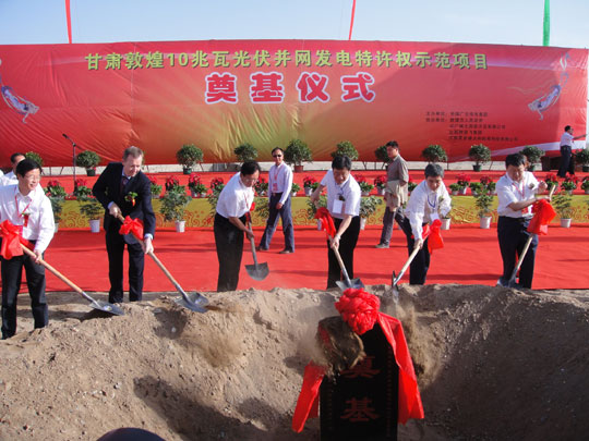 國家能源局副局長劉琦在奠基儀式上表示,敦煌項目是我國利用西部地區戈壁土地建設的第一座第一座大型并網光伏電站,也是國家通過特許權招標方式推動大型光伏電站建設的重要嘗試。這次招標大幅度降低了光伏電站建設成本和上網電價水平,增強了全社會發展光伏產業的信心。
